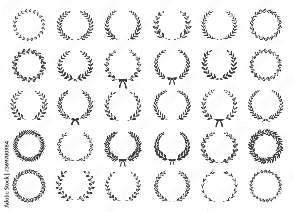 Foto Set of black and white silhouette circular laurel foliate and oak wreaths depicting an award, achievement, heraldry, nobility