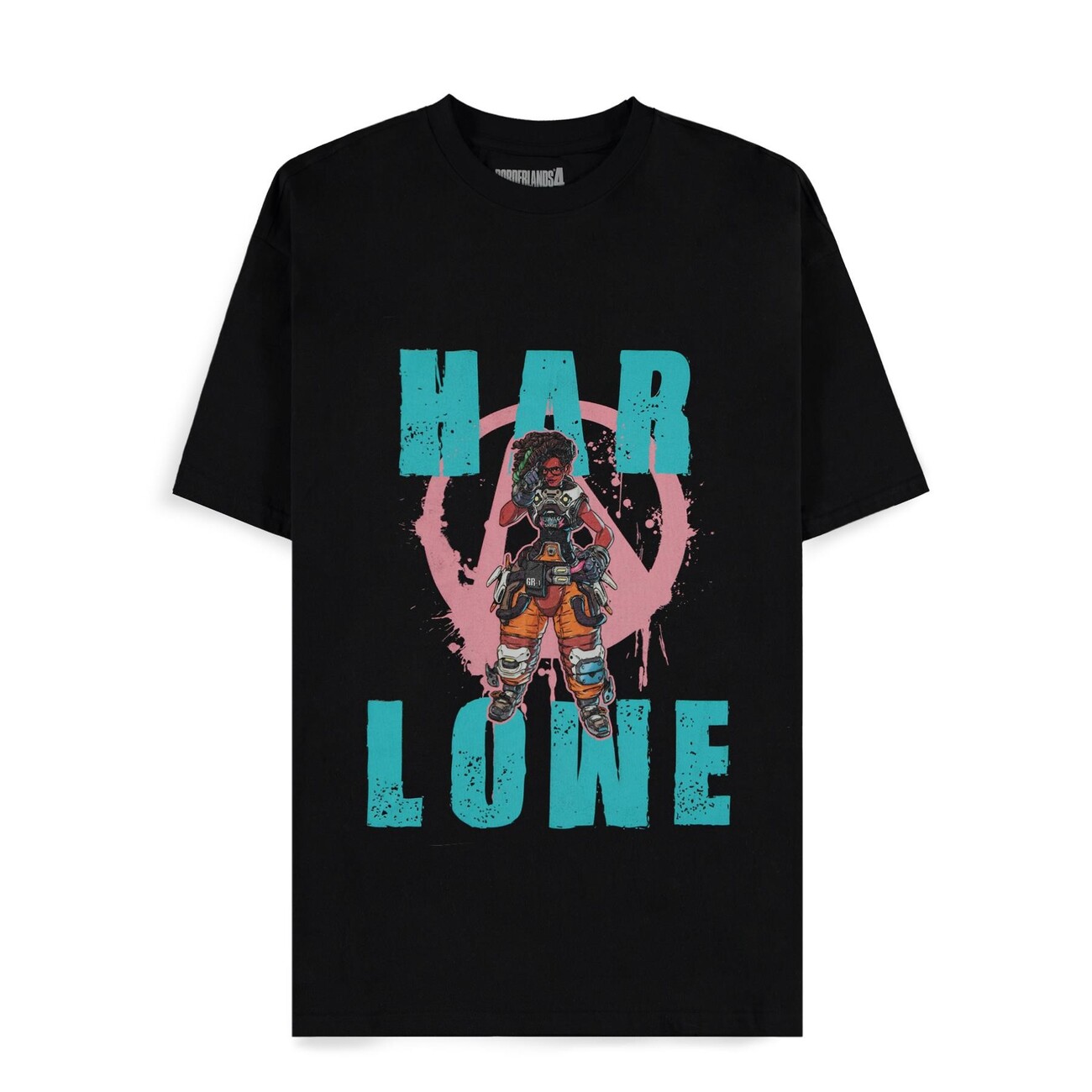 Harlowe staat centraal: de grote, contrastrijke borstprint trekt meteen de aandacht en verwijst direct naar de Borderlands-wereld. De print is zacht en comfortabel; 100% katoen met een klassieke fit zit de hele dag prettig. Duidelijke Borderlands-link — rauw én stijlvol.