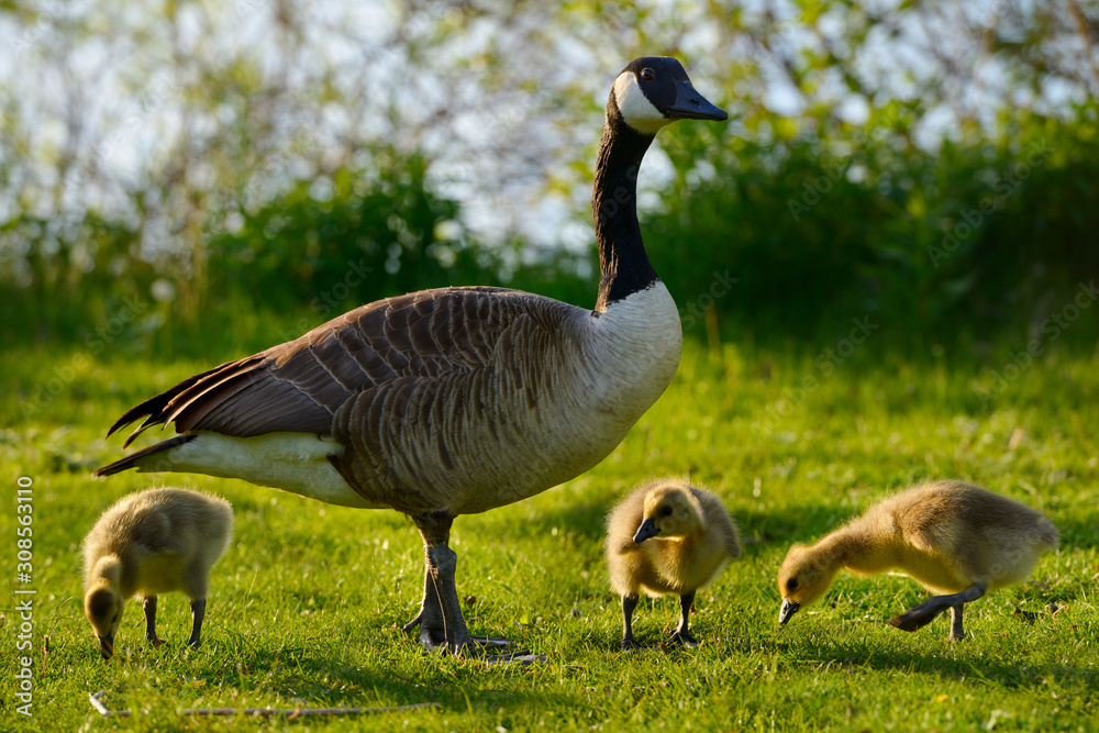 Schilderij op canvas Protective parent Canada Goose with three goslings on Toronto Island with Lake O