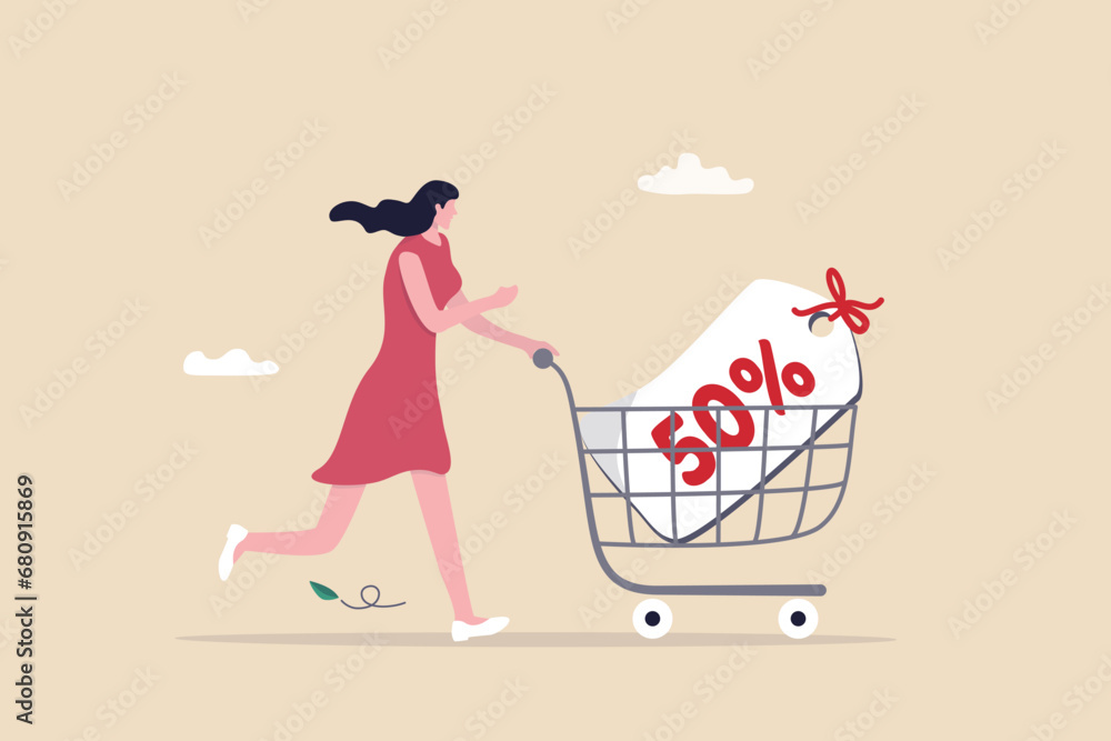 Behang Sales discount online shopping, promotion or bargain retail purchase, e-commerce marketing or sales price tag concept, young woman with shopping cart trolley 50 percent discount price tag