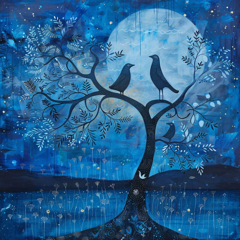 Schilderij op canvas Blue Moon & bird, Starry Night Magic, frame wall decor
