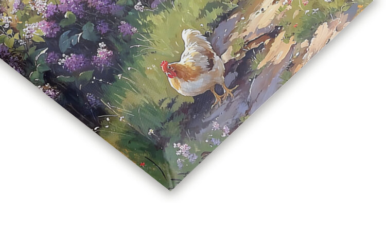 Schilderij op canvas Flowers and poultry in a wooden cabin garden, canvas decor