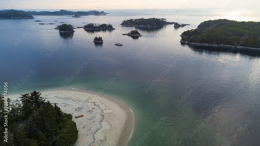 Schilderij op canvas Sandy beach with view of small islands at dusk
