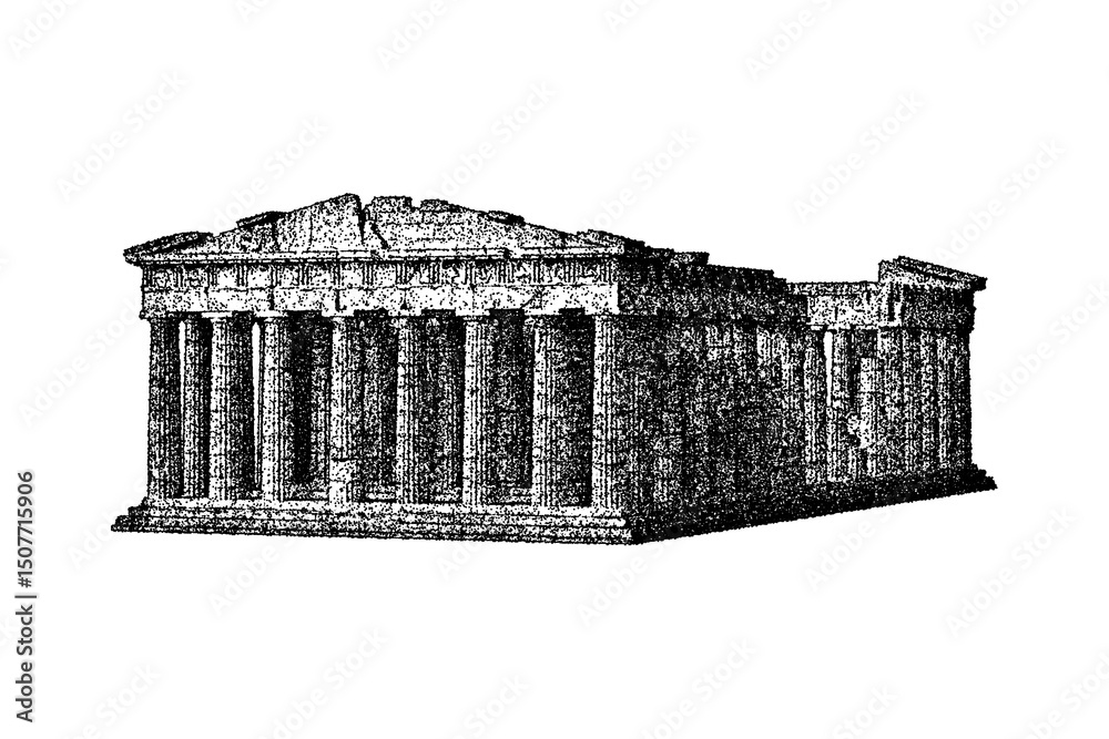 Sticker Parthenon ruins illustration in vintage stipple engraving style isolated on tran