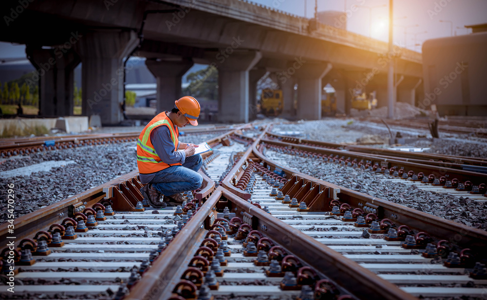Sticker Portrait engineer under inspection and checking construction process railway switch and checking work on railroad station